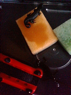 ∴ がんばれイモコ ∴ イモタとイモコ 相変わらずそれぞれの好きな場所でたそがれています。 イモタは濡れたスポンジの上、イモコは橋の下。 体つきが2匹とも似てきました。以前はだいぶ違いがあったのですが。(斑点模様など細かいところを挙げれば違いますが(汗)) 性格は違いがあるようで、 イモタはおとなしくのんびりマイペース。イモコは好奇心旺盛で何でも積極的。 一番顕著に出るのが餌をあげるときで イモタはレバーと虫しか食べません。それ以外は興味も示さず。 一方、イモコは何でも食べます。新しい食べ物にも興味を示します。 そんな違いからかイモコの方がちょっぴり賢い。 餌をあげる時に必ず水面から顔を出します。「ちょうだい。ちょうだい。」って言っているようだね。とSmile。 イモリにも条件反射はあるのかな??